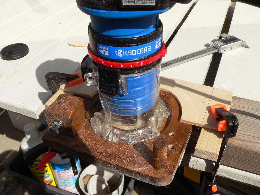 | この写真はいったい何をして居る所でしょうか? 2枚目の写真はいつも使っている自作のルーターテーブルに横向きにルーターをセットしたところです。 そしてテーブルに乗っているのはワークを45°に支えるためのジグです、これはスライド丸鋸で材料を45°に加工しこれで額縁などを作る為の加工用ジグですがこれを利用してワークを45°傾けて更にルーターに対して平行に加工できるようにしたものです。 ルーターの刃はφ5でこれで5mmの溝が作れますが一体これでなにをするかといえば3枚目の写真のように箱物の角に溝を掘りここに板厚5mmのカンザシを刺して強度を上げ、又色の異なる木材をカンザシにしてアクセントを付ける、それだけの物です。 加工時間を1とすると、この様にセッテングするのにかかる時間は10、更にこの為のジグを作るのに100の時間を、全ての構想には更に何倍もの時間を費やしての加工ですが、出来上がった物はそんな時間にはお構いなしで、どう考えても買った方が奇麗に出来ているのでしょう。 ただこの構想から出来上がりまでの時間を楽しむ、それが趣味と言うもので作品を見てこれってどうやって加工したのか? そう思っていただける、いやいやきっと不思議に思っていると妄想するだけで楽しい物です。 今日の撮影は久しぶりのD40のお出まし、更に35mm短焦点レンズなので結構向きと距離を変えてファインダーに移る絵を見るのはなかなか楽しい物です。 やっぱりZ-fxのモニター越しに見るのとは大きな違いですね、でも出来上がった写真はやはりZ-fxのモニターに移る絵に近いですね。 |