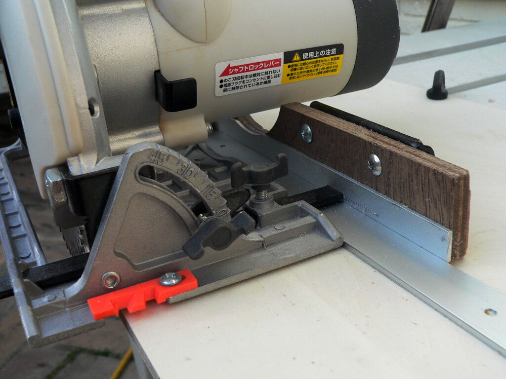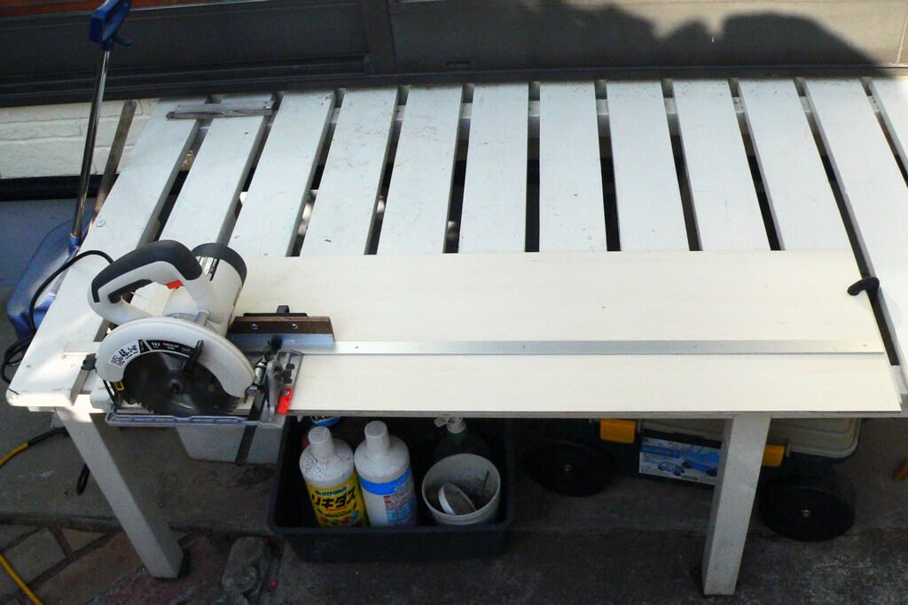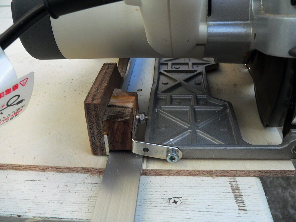 | 商店街の活性化とマイナンバーカードと免許書の連携を目的に市から貰った金券で購入した安物の丸鋸。 スライド丸鋸を持っているので殆どそれで賄えるのですがどうしても幅広のベニヤ板などの切り出しはスライド丸鋸では歯が立たず購入したのだが、一度使ってみてその使い辛さに呆れて半年以上お蔵入りになっていたのですが家内からの制作依頼で引っ張り出してきたのですがどうしてもまっすぐに切れません。 付属のガイドを使っても片支持の為ふらついてとんでもなく波打つ板しか切り出せないし、そもそも精度とは無縁、両手でガイドに慎重に押さえながら切断するのですが全然だめで、U-tubuの丸鋸ガイドの製作記事を読み漁りたどり着いたのが一枚目の写真の物。 20mm*100cmT=3mmのアルミバーをガイドにしてスライドさせるものです、材料費を押さえる為ベースはT=5mmのシナベニアです。 丸鋸ガイド側には付属のガイドに9mmべニアでガイドを裏打ちし、ガイドとなる部分には破材で持っていた15mm*t=2mmのアルミ材を接着止めしました。 モーターの逃げやらガイドの逃げ等工作部分が多く、このままでも両手で支えれば使えますがやはり片支持だとガイドから逃げてしまうので3枚目の写真にあるように後部にL字の金物を使い丸鋸のベースにタップを切って固定しましたがこれで片手でも真っすぐ切れる、と言うか真っすぐにしか切れないガイドが完成しました。 高級な丸鋸は前後にガイドが取りつくようになっていてこの様な面倒な加工は必要ないのですが、安物買いの銭失いとは良くいったものです。 まあこれで制作する物の材料選択の余地が増え安く色々な物が作れるとワクワクする70才です。 |